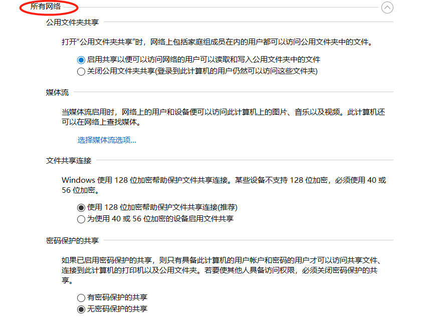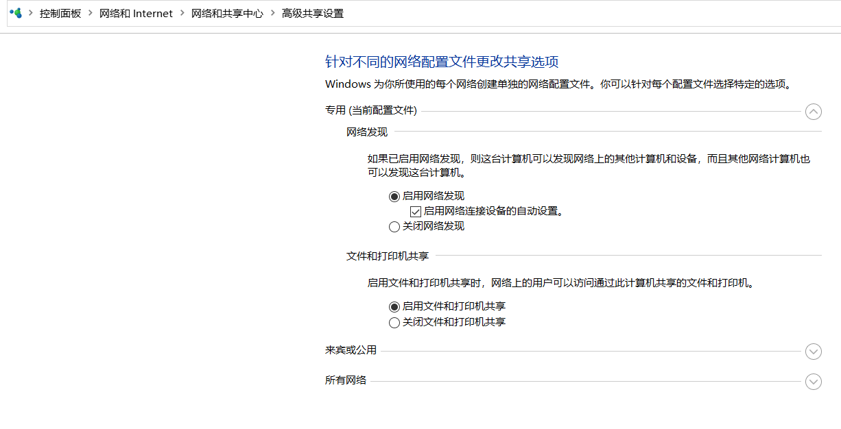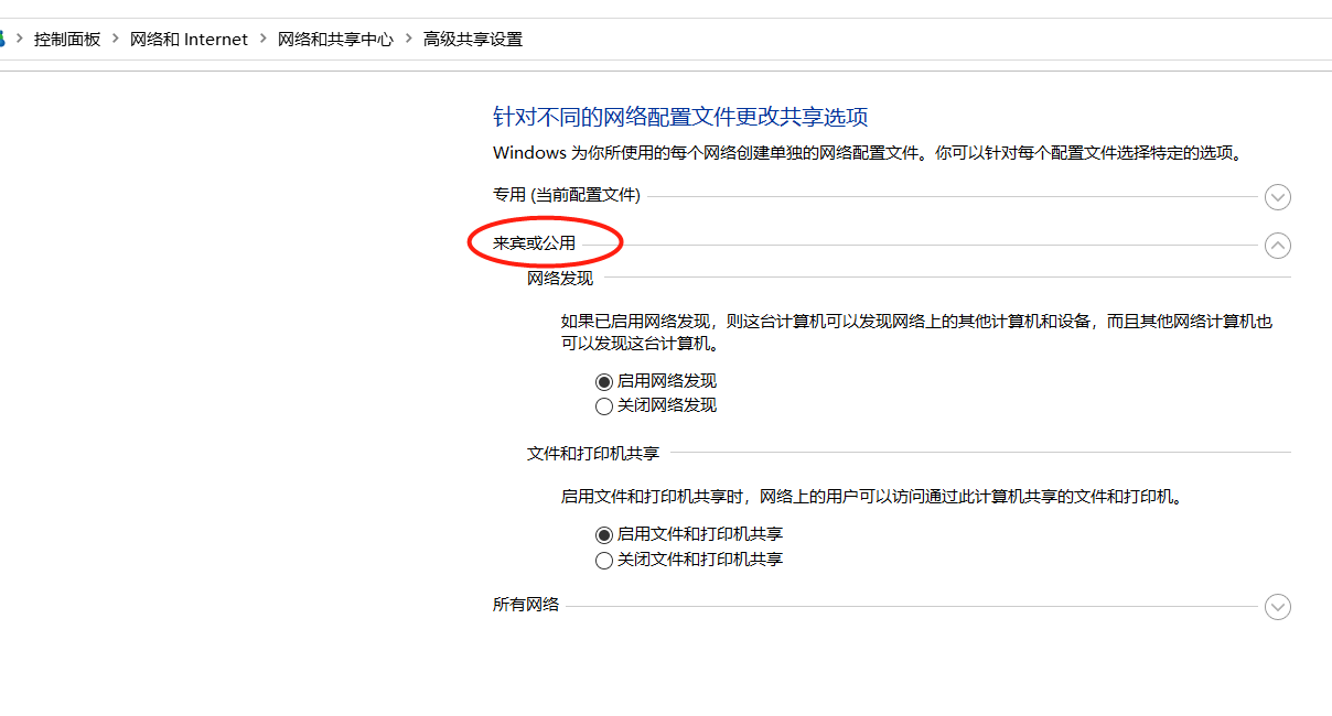 一、打开网络和共享中心,设置目标计算机的共享设置(网络发现,来宾或公用,所有网络)为方便省事,把权限开到最大了。