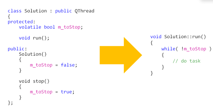 (2)、在线程类中增加标志变量m_toStop(volatile bool类型,一定注意不要让编译器优化)