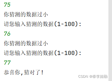 ② 使用死循环让用户不断猜测并提示用户范围,猜大提示过大,猜小提示过小,猜中使用break结束游戏.
