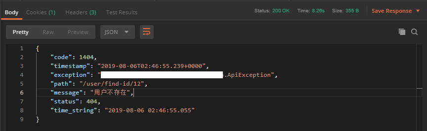 这个和之前的结果是完全不同的,其中code是我自己定义的错误码,ApiException是我自定义的异常,所以这里全局异常处理是生效了。