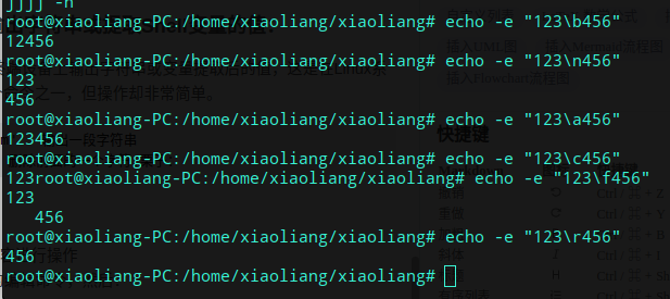 echo -e “\f” : 换行,光标扔停留在原来的坐标位置