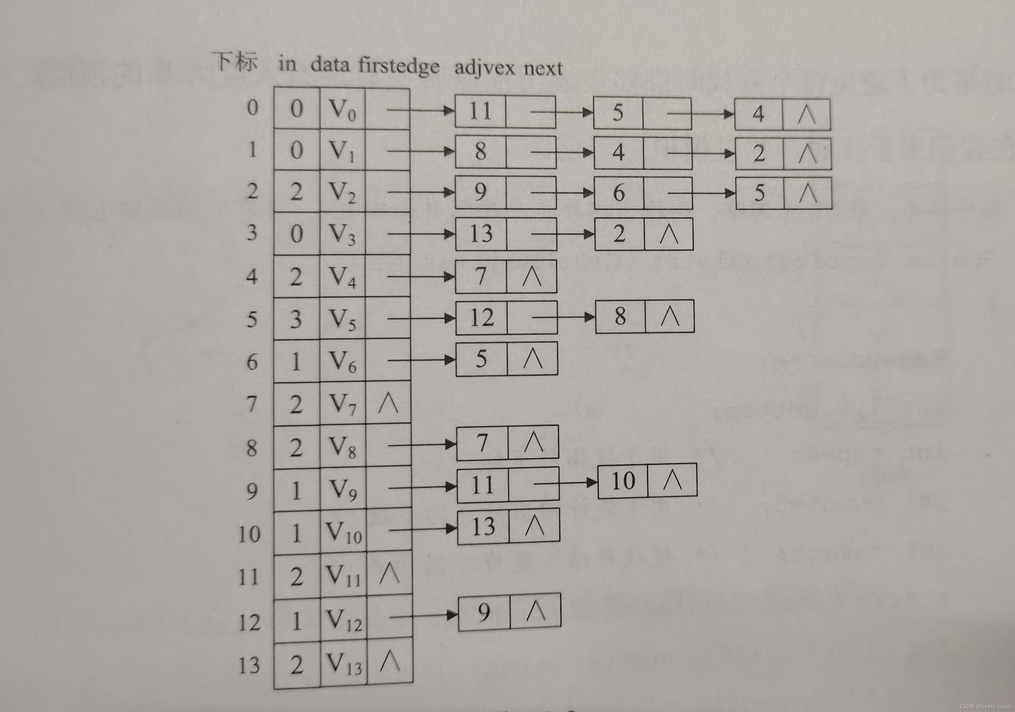 (前面求最小生成树和最短路径时,我们用的都是邻接矩阵,但由于拓扑排序的过程,需要删除顶点,显然用邻接表更加方便,因此我么需要为AOV网建立一个邻接表,需要三个数据域, in(表示该顶点的入度个数),data(存放数据信息),firstedge(存放邻接点的信息,也就是边表),