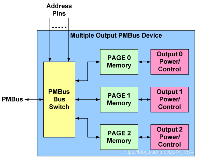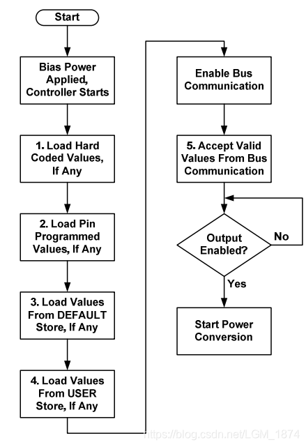 - 最后,一旦前面的步骤完成,PMBus设备将开始接受来自SMBus的命令。请注意,这意味着从总线写入的值将覆盖所有以前的值,包括硬编码、管脚编程或从默认和用户存储区复制的值。