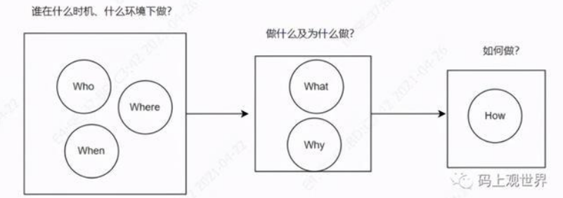 用5W2H进行分析:用户(WHO)在什么环境(WHERE)下遇到什么时机(WHEN)因为什么(WHY)产生什么目标(WHAT),继而通过什么方法(HOW)去达成目标。大部分场景不需要考虑HOW MUCH。