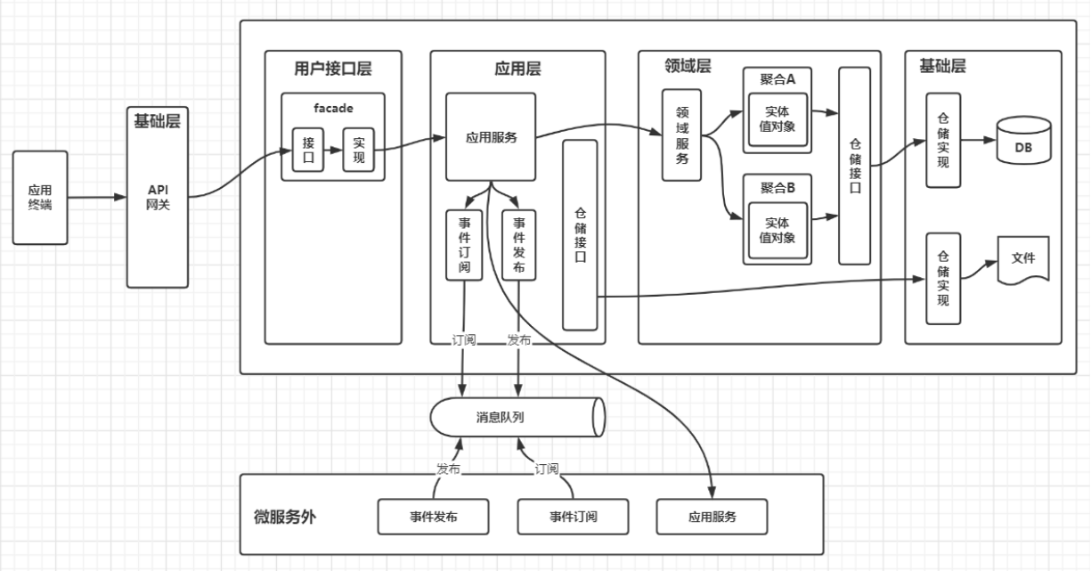 - 应用层编排成应用服务后,被接口层facade封装,完成接口和数据适配后,以粗粒度向API网关发布服务