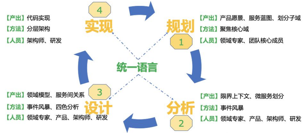 如果团队对于业务比较陌生适合采用事件风暴方法进行梳理;如果团队对业务比较熟悉,如果业务流程相对简单,则可以采用四色建模法进行业务梳理。采用这些分析业务的方法可以保证产研团队对业务逻辑的理解在一个水平上。