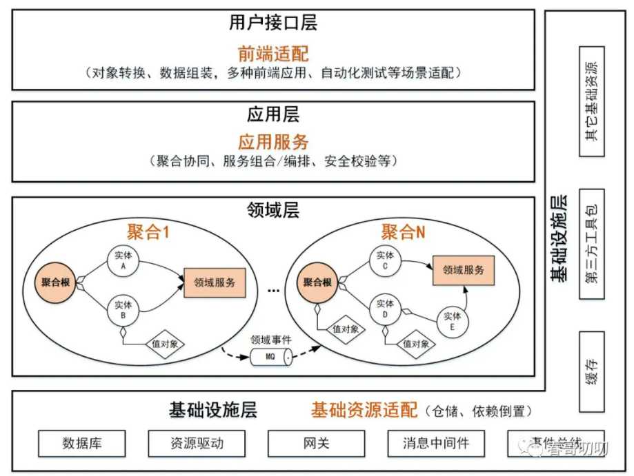 - 基础层贯穿了DDD所有层,包括第三方工具,API网关,消息中间件,分布式事务,消息最终一致性能力,数据库,缓存能能力的提供。