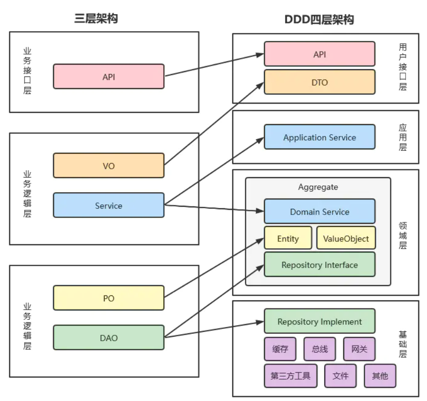 - 基础层有仓储模式的代码逻辑,通过仓储接口和仓储实现,解耦领域层和基础层,保证领域核心业务逻辑的干净,降低DB资源变化给领域层带来的影响,这部分内容,请见下回分解。