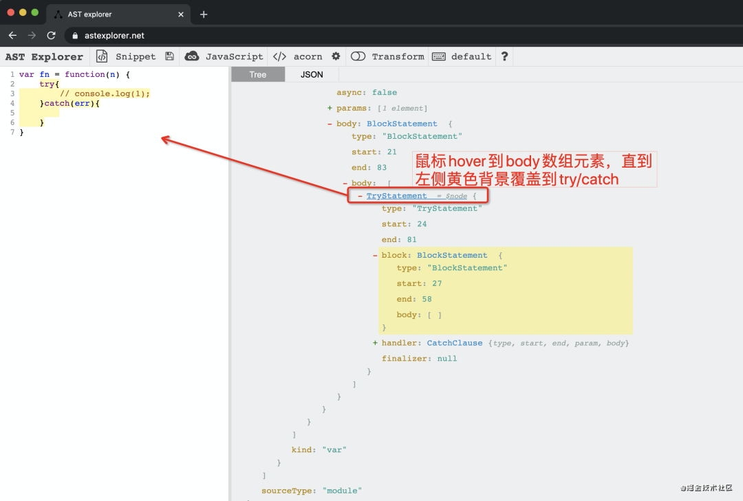 那么我们如何知道它的表达声明type是什么呢?这里我们可以 使用 astexplorer 查找它在 AST 中 type 的表达。如上截图得知,try/catch 在 AST 中的 type 就是