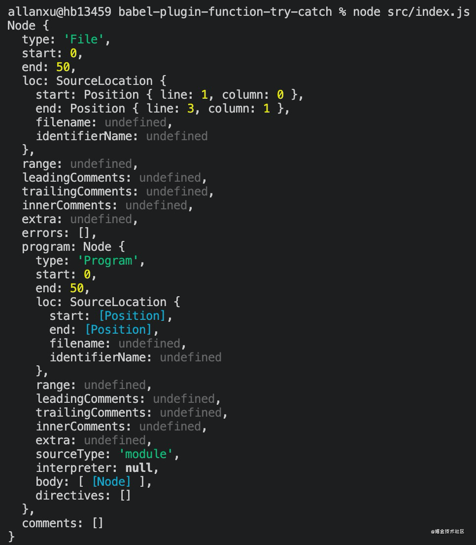 终端执行 node src/index.js,可以打印看到当前函数的 AST 节点信息。