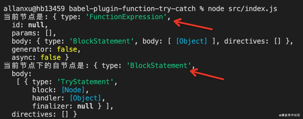 此时将上述代码在终端执行 node src/index.js:可以看到此时我们在一个函数表达式 body 中创建了一个 try 函数(TryStatement)。最后我们需要将原函数节点进行替换: