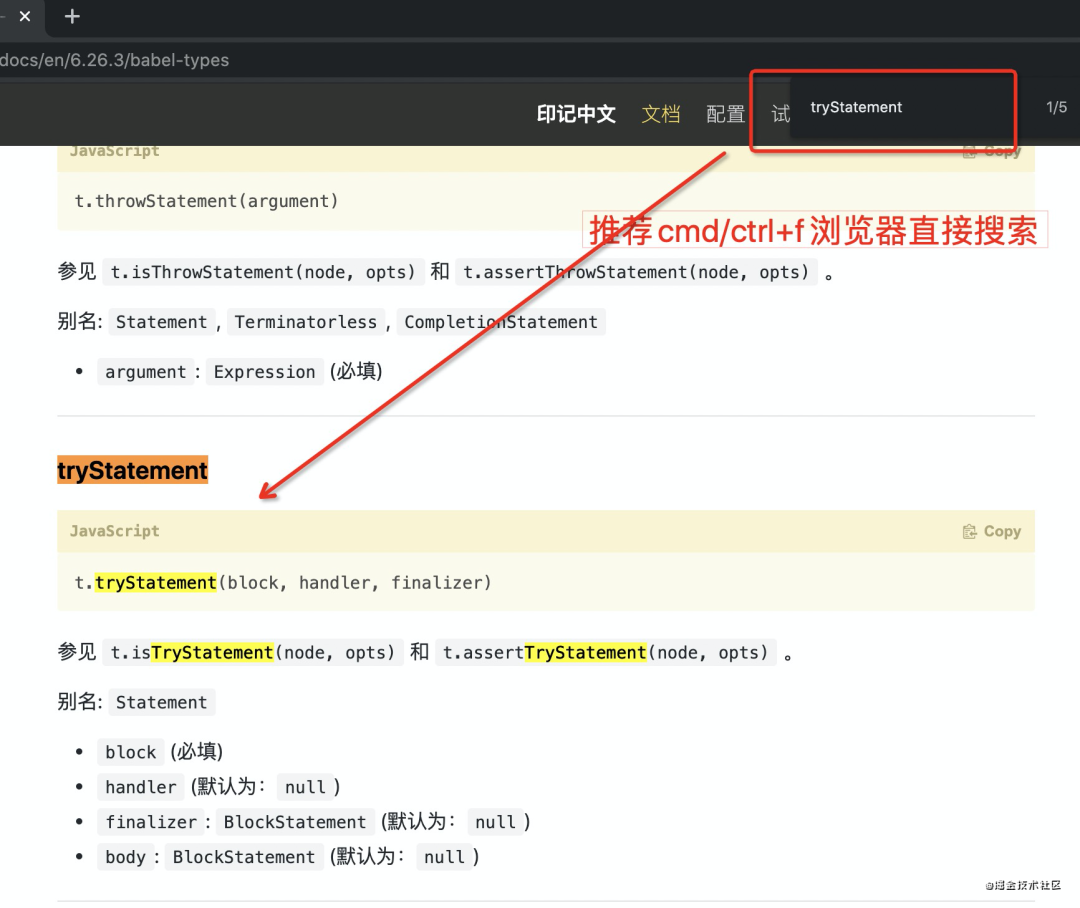 然后去 @babel-types 官方文档查找对应方法,根据 API 文档来创建即可。如文档所示,创建一个 try/catch 的方式使用