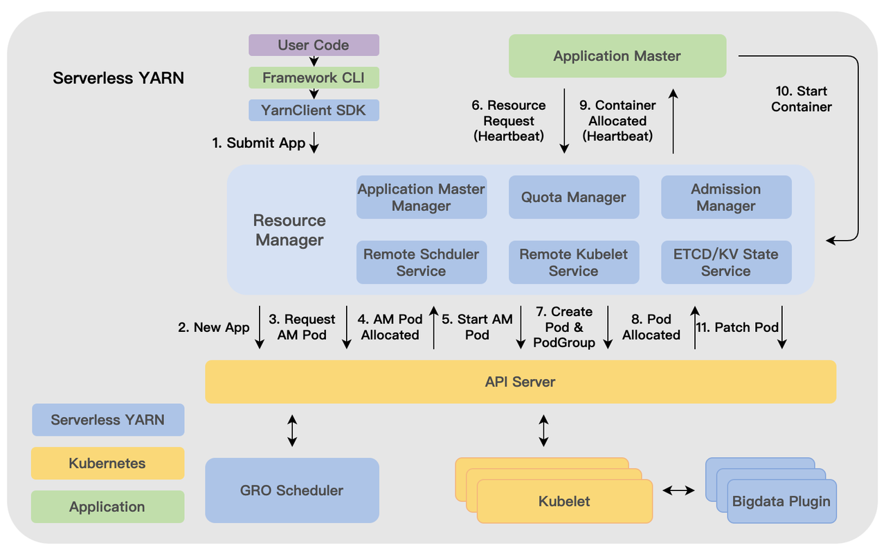 - 用户在计算引擎的基础上进行开发,调用 YarnClient SDK,提交作业到 Serverless YARN 的 Resource Manager 组件;