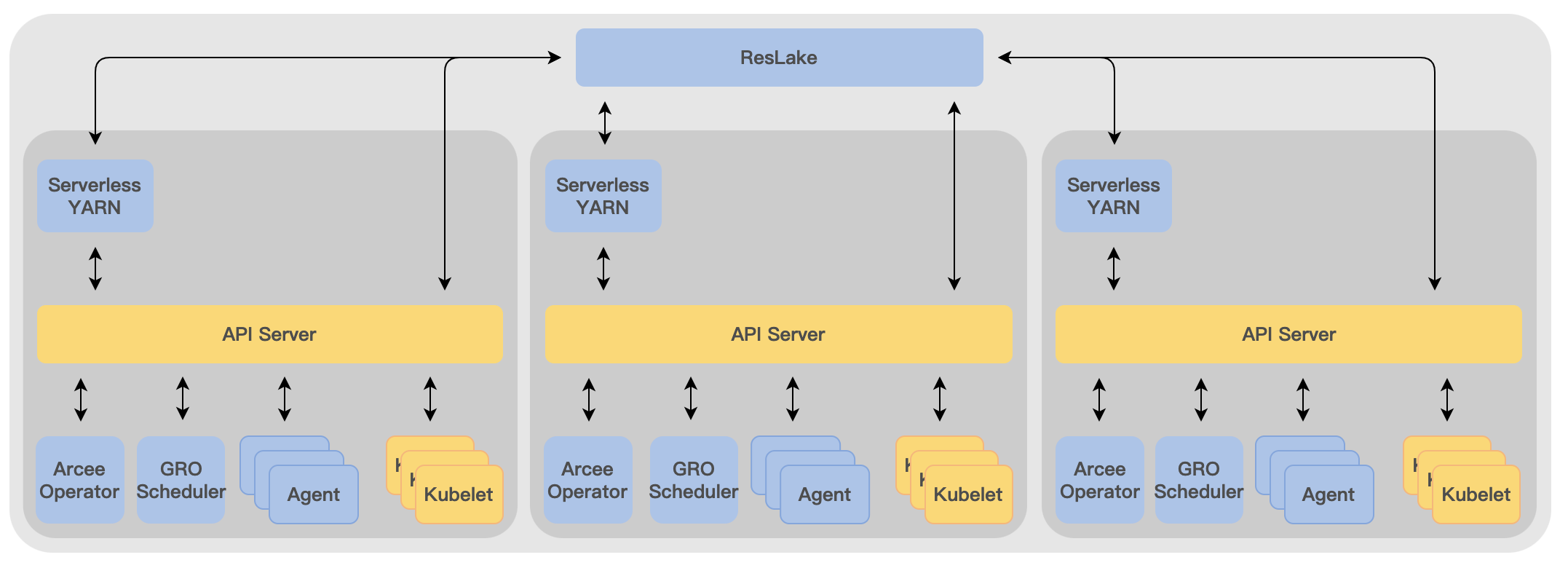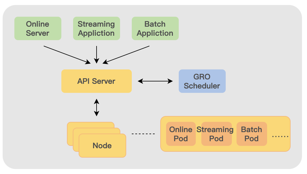 大数据作业部署在云原生系统上,在线服务也部署在云原生系统上,在离线业务可以同时部署到同一个集群上。GRO Scheduler 统一管控云原生集群资源,同时调度在线服务和大数据作业。