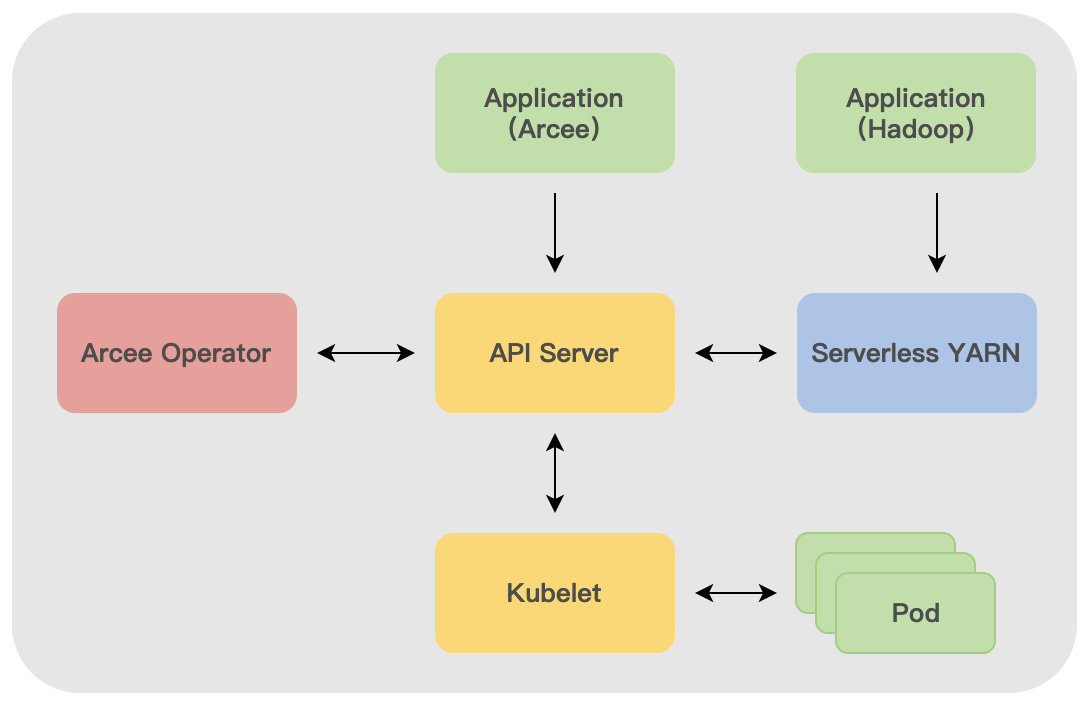Serverless YARN 是基于云原生的 YARN 解决方案,帮助大数据作业透明迁移到云原生系统。简单来说,在 K8s 系统上模拟实现了 YARN 系统,传统作业可以像往常一样提交和运行,不需要进行任何改造,完全感知不到 K8s 的存在。