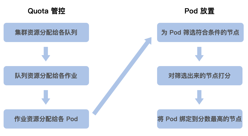 Quota 管控:调度器首先将集群资源分配给各个队列,然后将队列资源分配给该队列的各个作业,最后将作业资源分配给该作业的各 Pod。不是所有 Pod 都可以获得资源,只有获得资源的 Pod 才可以进入后续的 Pod 放置流程;