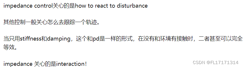 PD控制和阻抗控制看起来的确很像,但是目标不同。PD控制是用于轨迹跟踪(tracking),而阻抗控制是对外力矩呈现柔性(compliance)。