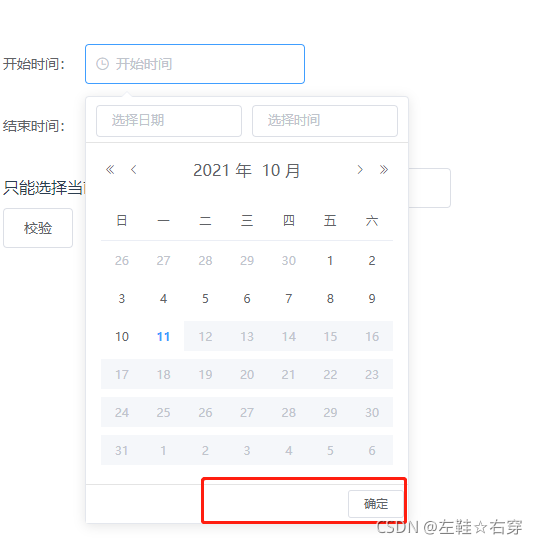</el-date-picker>在<el-date-picker>这个标签内加入popper-class="no-atTheMoment",这个是官方提供的日期弹出层添加样式的方法,用这个classname做限制,不想显示“此刻”的,就加上这个,想显示的,就去掉它即可。