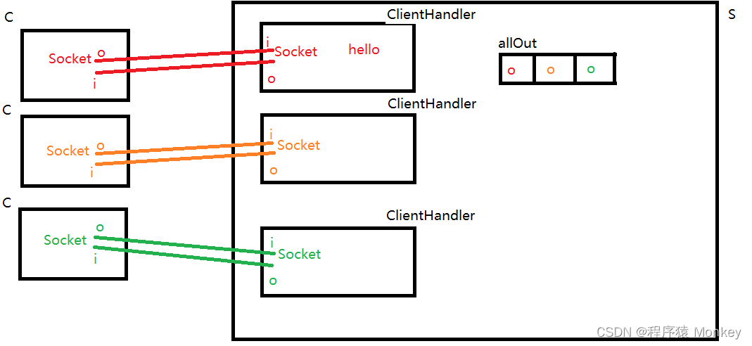 问题:例如红色的线程一收到客户端消息后如何获取到橙色的线程二中的输出流?得不到就无法将消息转发给橙色的客户端(进一步延伸就是无法转发给所有其他客户端)