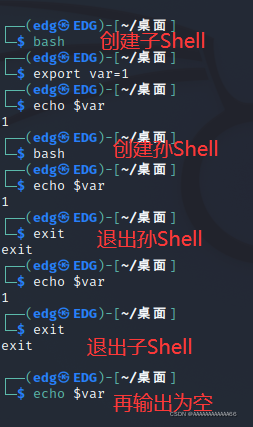 ─(edg㉿EDG)-[~/桌面] └─$ name=Bob ┌──(edg㉿EDG)-[~/桌面] └─$ echo $name Bob ┌──(edg㉿EDG)-[~/桌面] └─$ unset name ┌──(edg㉿EDG)-[~/桌面] └─$ echo $name(上面的示例可以看到name变量被取消了,我之前在学习其他语言的时候并没有学到取消变量的操作,也可能是因为我菜)