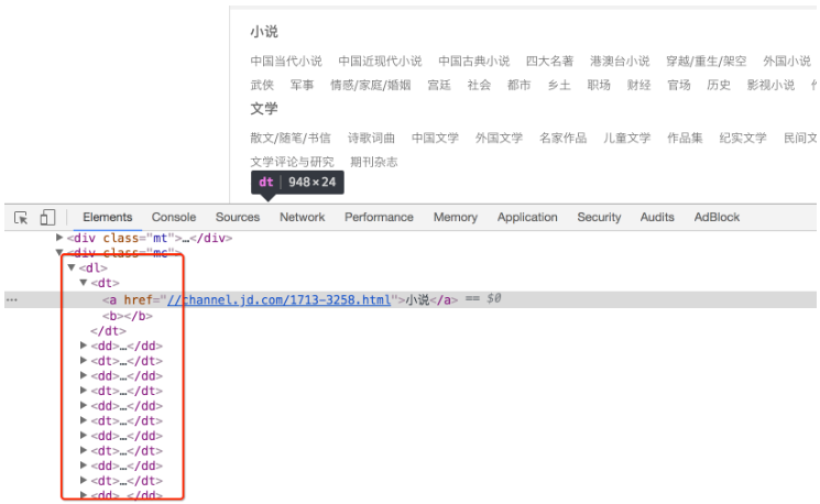 数据都在dl下的dt和dd中,其中dt是大分类的标签,dd是小分类的标签
