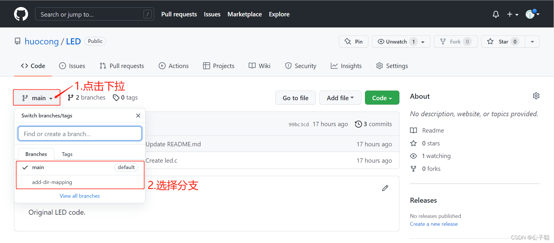 1、进入相应的仓库,点击“Switch branches/tags”,在出现的下拉框中,选择相应的分支。(这里选择main分支)