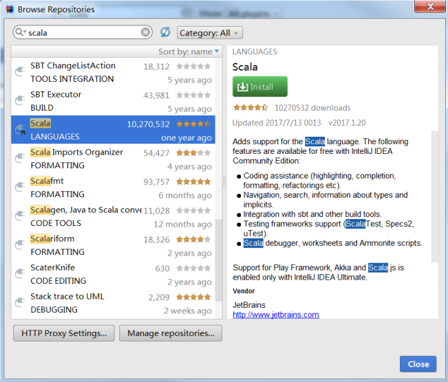 默认情况下IDEA不支持Scala的开发,需要安装Scala插件。