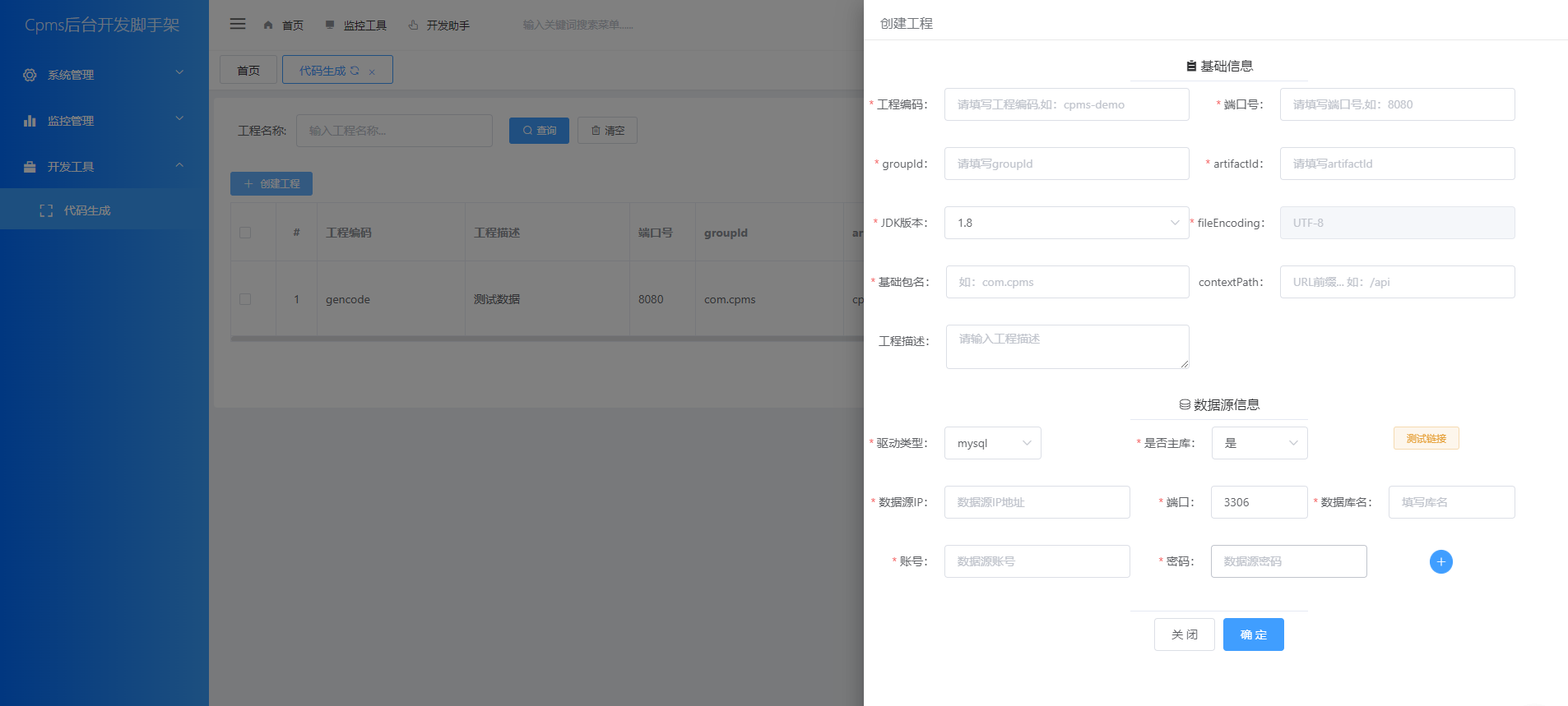 上面的表单主要分为两个部分:工程基础信息(工程的包名、端口号、JDK版本、groupId、artifactId等)、数据源信息(支持多数据源配置)