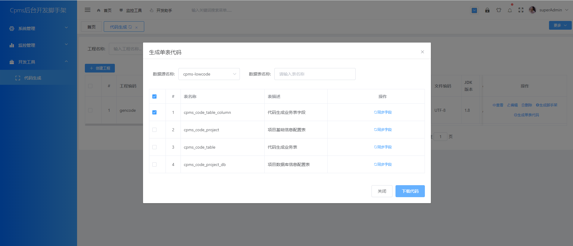 项目中还涉及到动态数据源切换的操作,主要目的就是当我们的数据库新增或修改表结构的时候,我们可以实时的同步到我们本地项目的表中保存下来,免去了手动导入表结构,这里有别于大部分开源项目实现代码生成的方式;