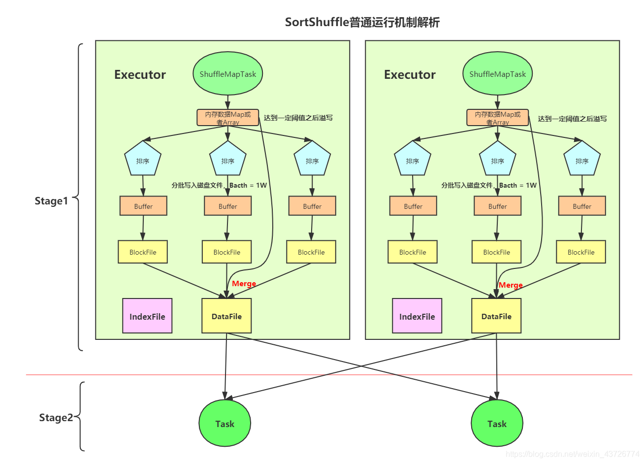 一个task将所有数据写入内存数据结构的过程中,会发生多次磁盘溢写操作,也就会产生多个临时文件。最后会将之前所有的临时磁盘文件都进行合并,这就是merge过程,此时会将之前所有临时磁盘文件中的数据读取出来,然后依次写入最终的磁盘文件之中。此外,由于一个task就只对应一个磁盘文件,也就意味着该task为下游stage的task准备的数据都在这一个文件中,因此还会单独写一份索引文件,其中标识了下游各个task的数据在文件中的start offset与end offset。