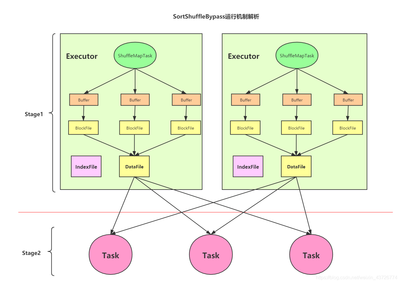 不会为每个reduce中的Task生成一个单独的文件,相反,sortshuffle会把mapper阶段中每个ShuffleMapTask所有的输出数据Data只写到一个文件中,因为每个ShuffleMapTask中的数据需要被分类,所以,sortShuffle使用了index文件存储具体ShuffleMapTask输出数据在一个data文件中如何分类的信息。所以,基于SortShuffle会在mapper阶段中的每一个ShuffleMapTask中产生两个文件:Data文件和Index文件,其中data文件是当前ShuffleMapTask输出的数据文件,index文件中存储了data文件中数据通过Partitioner分类信息,此时,下一个阶段的stage中的task就是根据index文件从上一个stage中所有ShuffleMapTask的data文件获取自己所需要的数据。