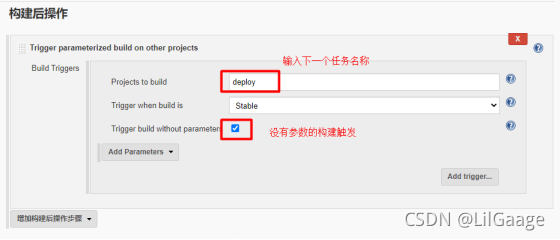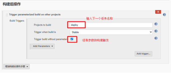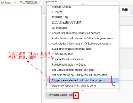 ③配置构建后操作步骤:选择下一个被触发的任务。