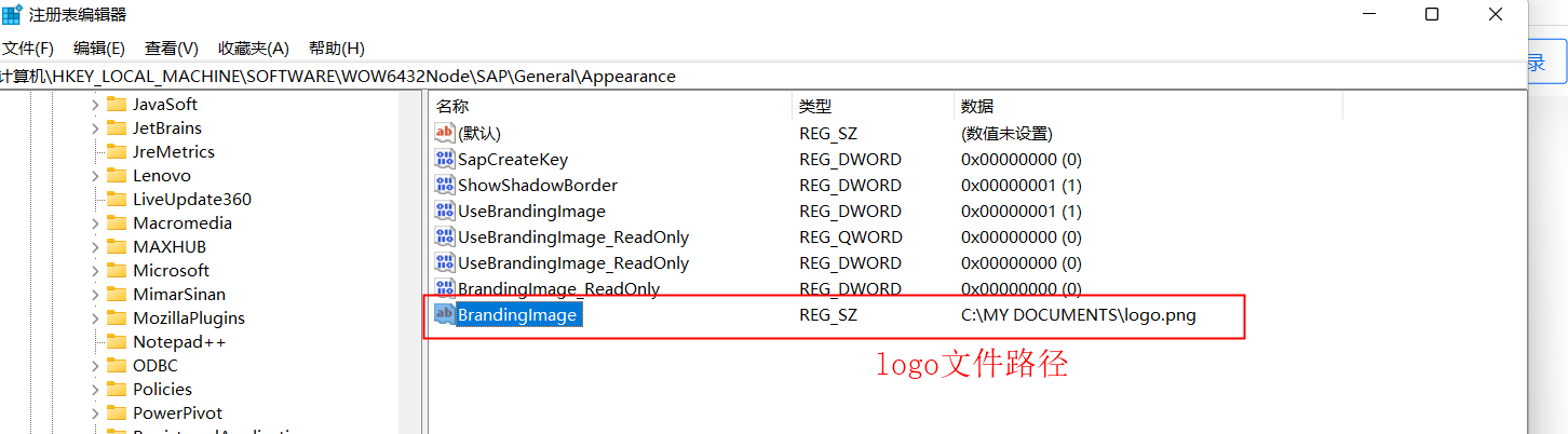 - 打开注册表后,找到 HKEY_LOCAL_MACHINE\SOFTWARE\WOW6432Node\SAP\General\Appearance 下,在右边添加以下REG_DWORD属性.