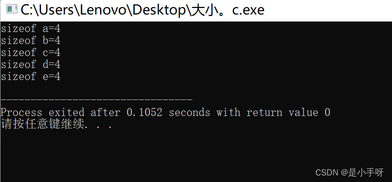 printf("sizeof c= %d\n", sizeof(c));