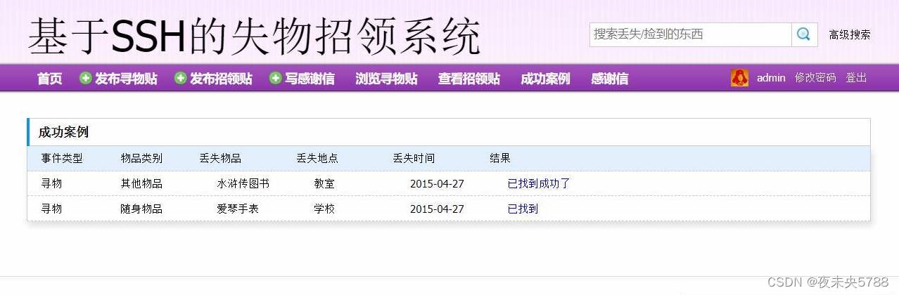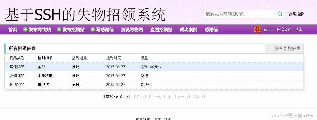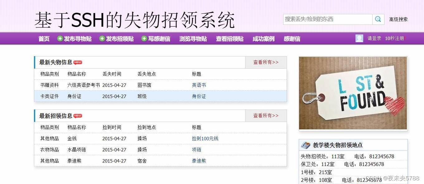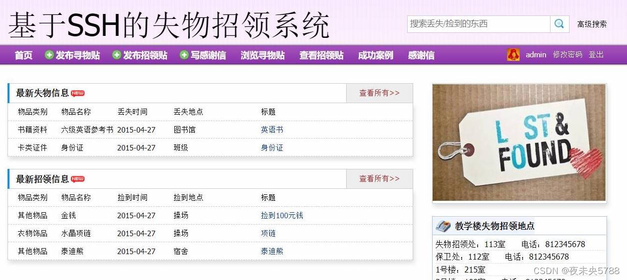 管理员登陆,用户信息管理,招领列表管理,寻物信息管理,公告管理,留言感谢管理,系统日志管理等功能。