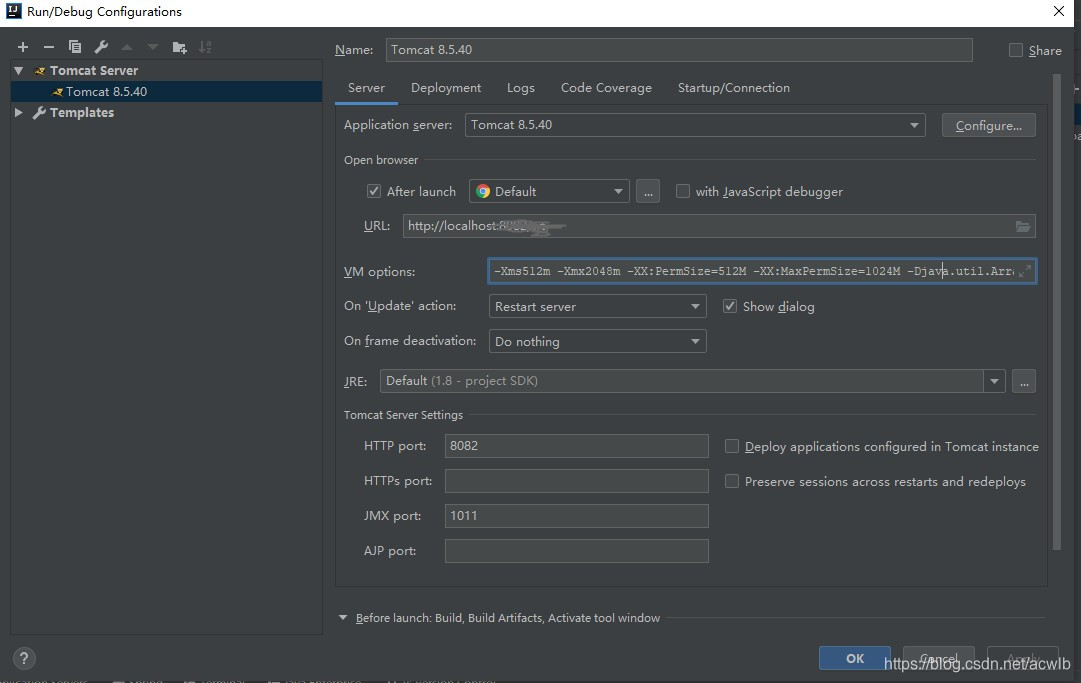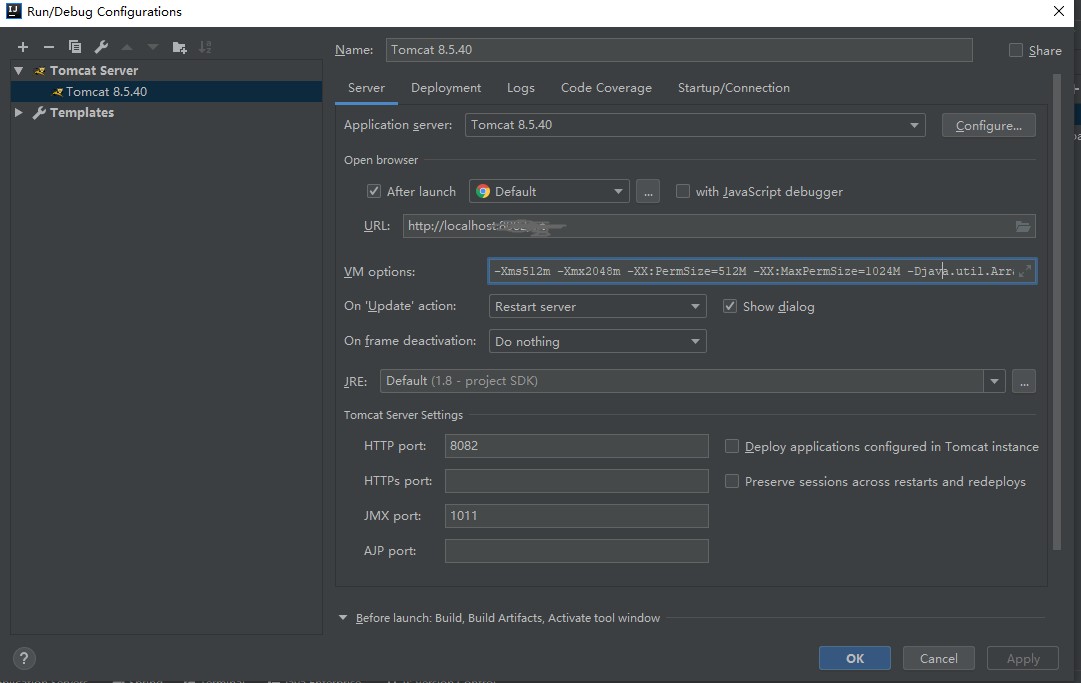 解决办法:打开tomcat设置页面,VM options加上参数:
