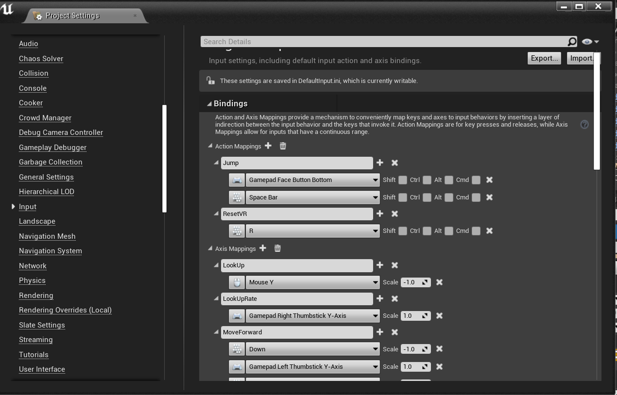 2.当按下运行之后,可以按下键盘wasd对机器人进行控制,这是因为在项目设置中已经对输入进行了一些动作映射. PlayerInput中定义了 两种结构体。第一种是 FInputActionKeyMapping,它定义了操作映射(ActionMapping)。另一种是 FInputAxisKeyMapping,它定义了轴映射(AxisMapping)。