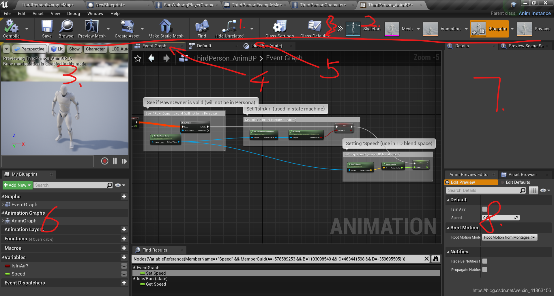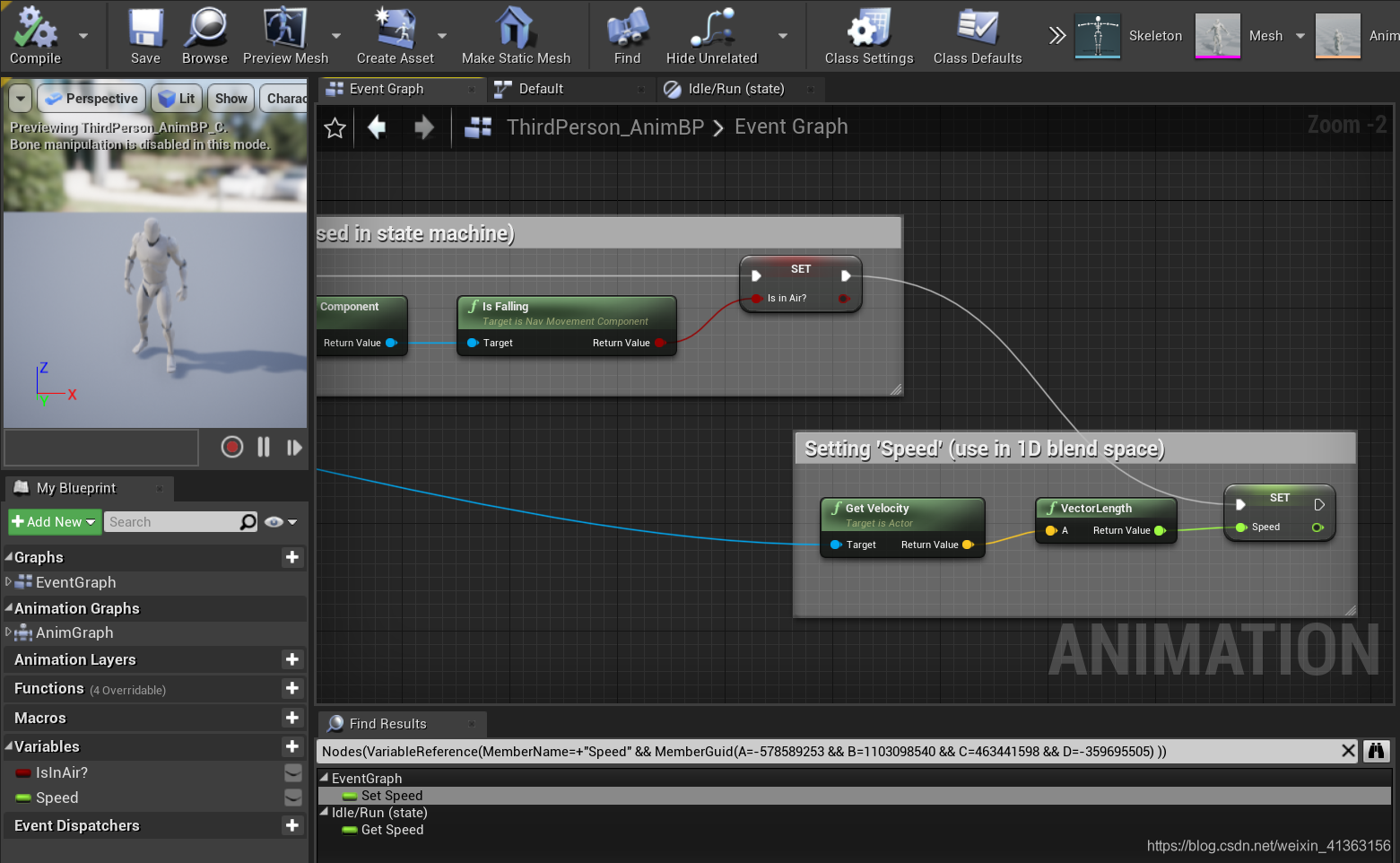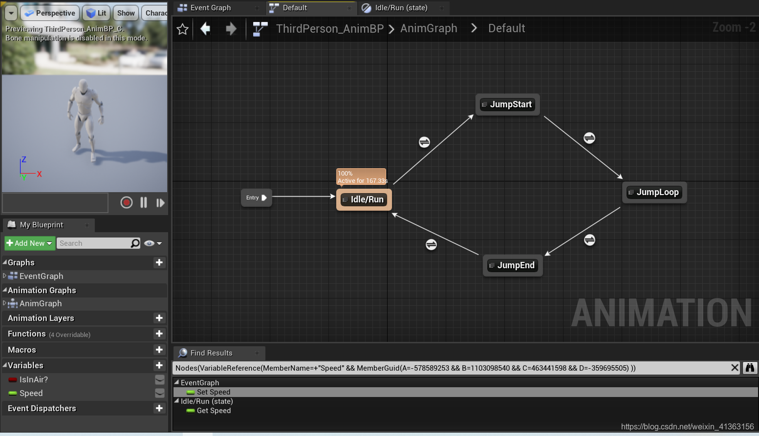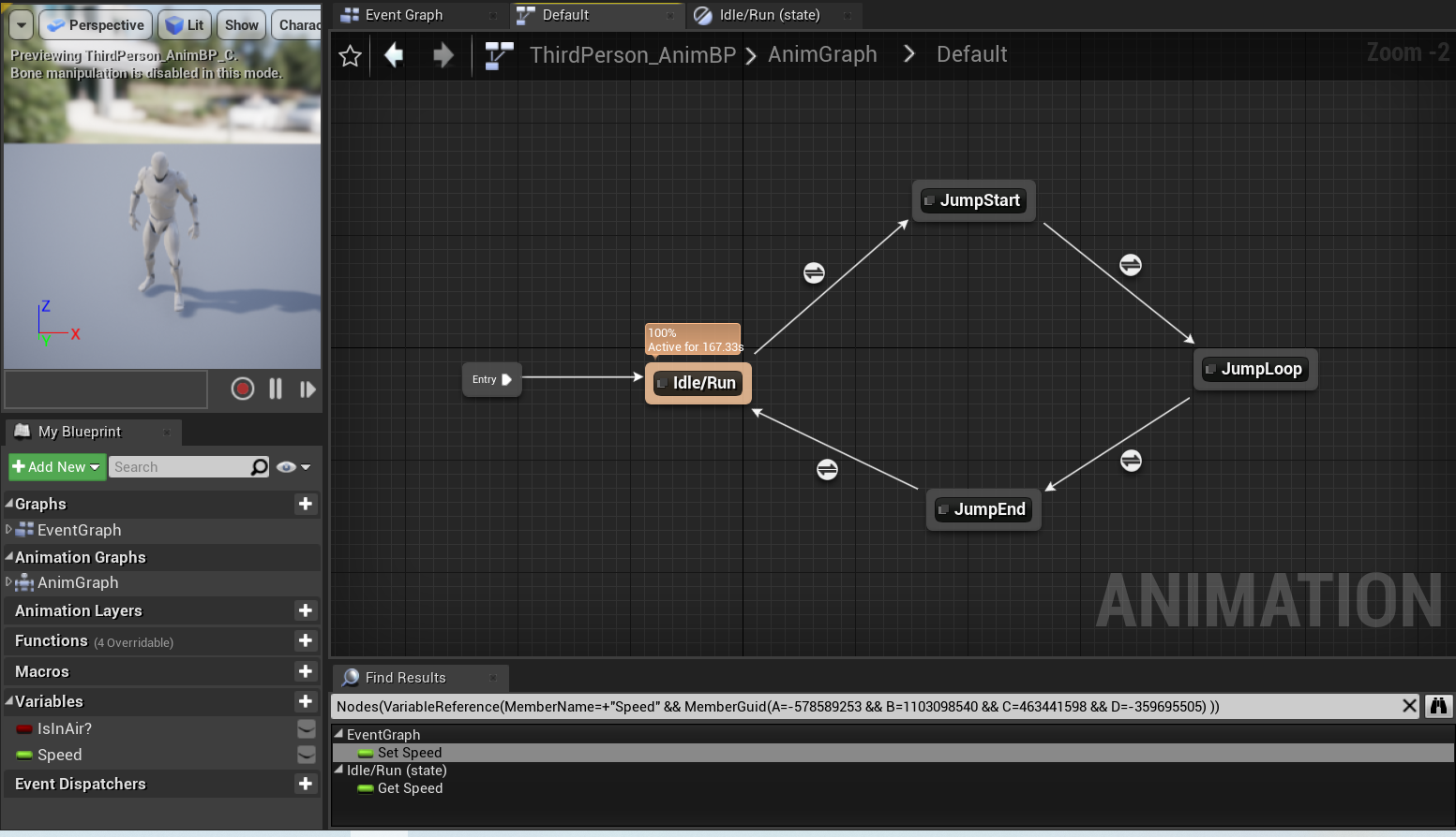 根据上图可以看到,在模板中创建了两个变量:Float类型的名字为Speed、布尔类型的名字为IsInAir?,可以知道一个变量为速度,一个标志着是否在空中。通过修改这两个值来修改动画图表中的输出的最终Pose。接下来打开动画图表