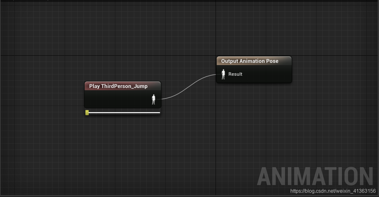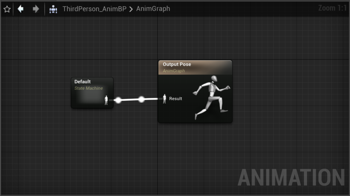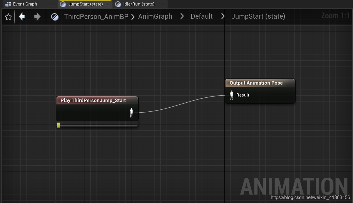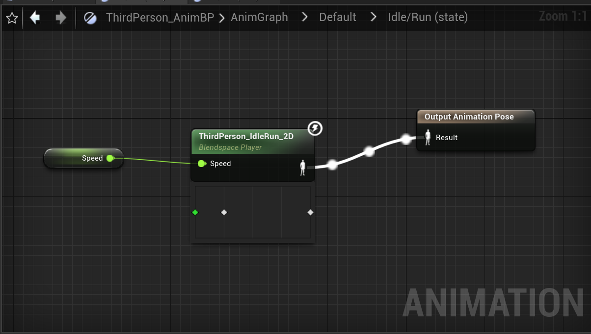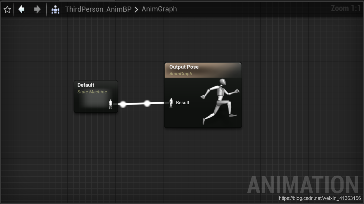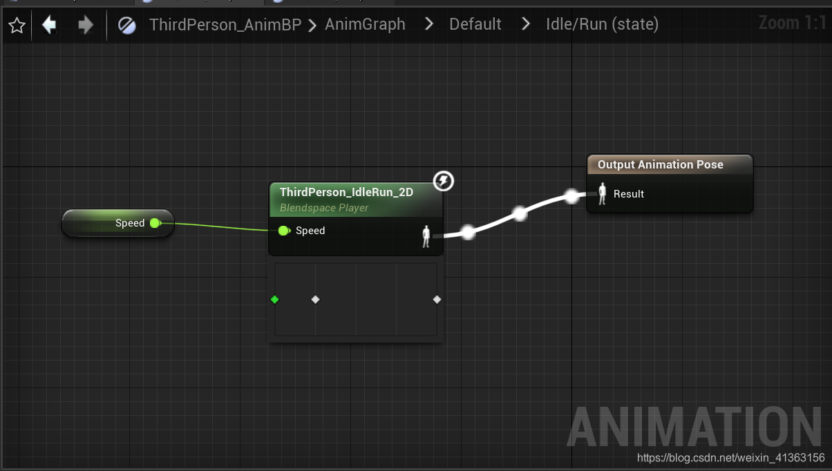在这里它使用了一个BlendSpace 1D,通过传入的Speed数值来将两段动画序列进行混合,输出混合的pose,当我们没有按下wasd时,人物的速度为0,则现在处于Idle状态,所以输出的姿势为Idlepose,动画蓝图便会在Tick中对Idle动画序列进行评估,拿到最终的Pose,