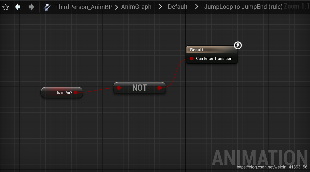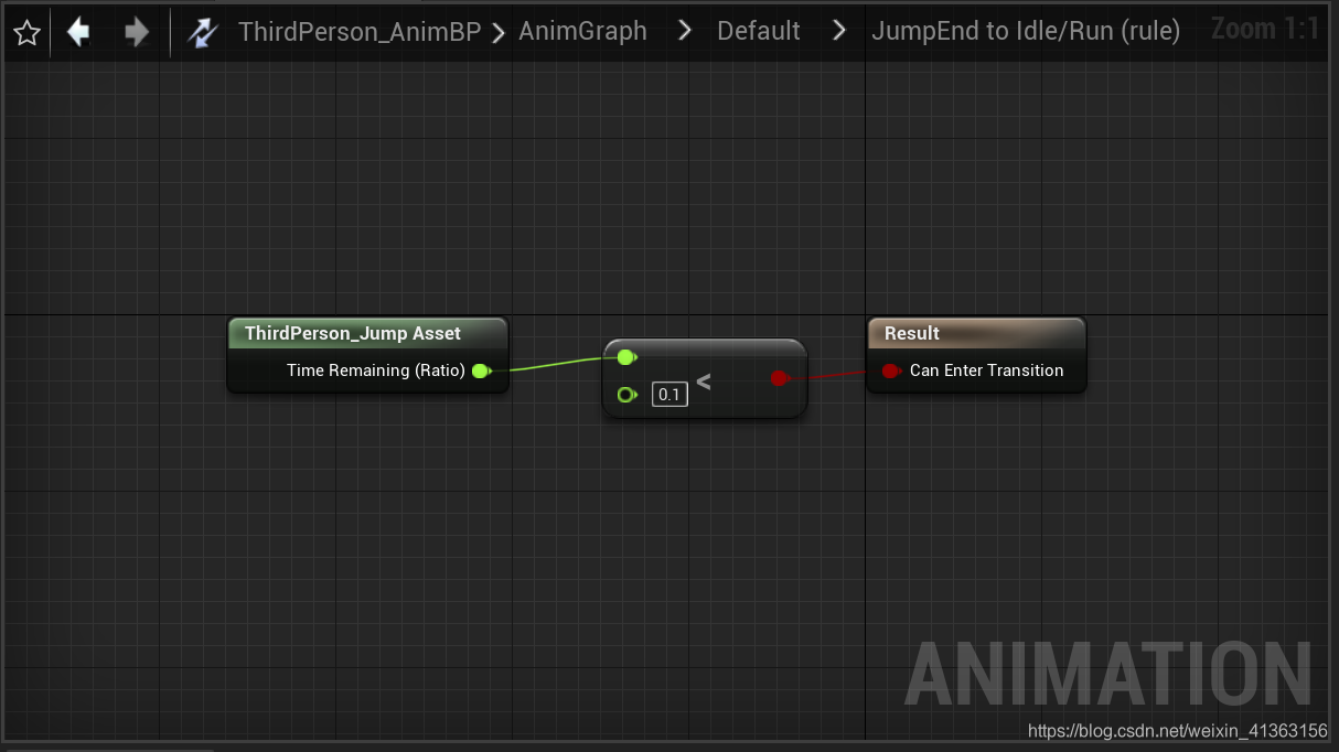 打开第三人称模板的状态机就可以看到有一个入口连接着Idle/Run,并且通过状态检查,来切换到跳跃状态,在通过状态检查,若状态符合就切换到跳跃循环,在通过状态检查,若状态符合就切换到跳跃结束,