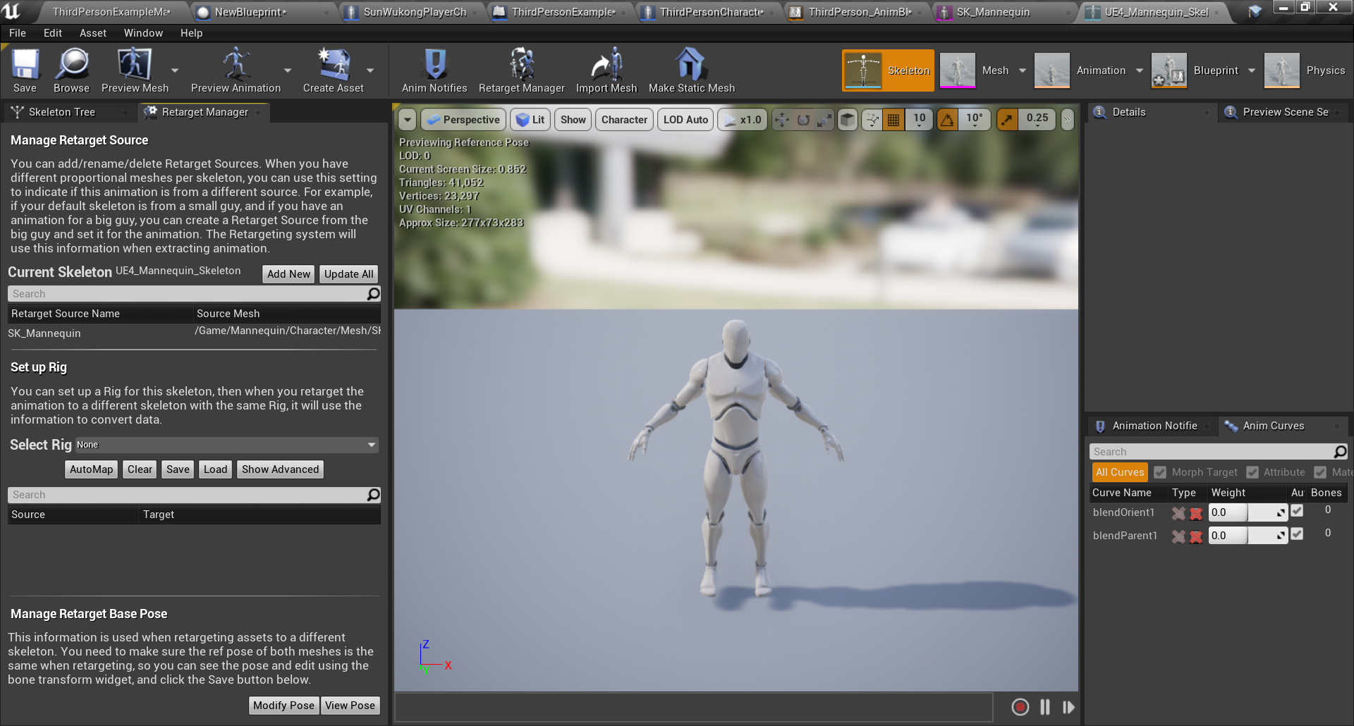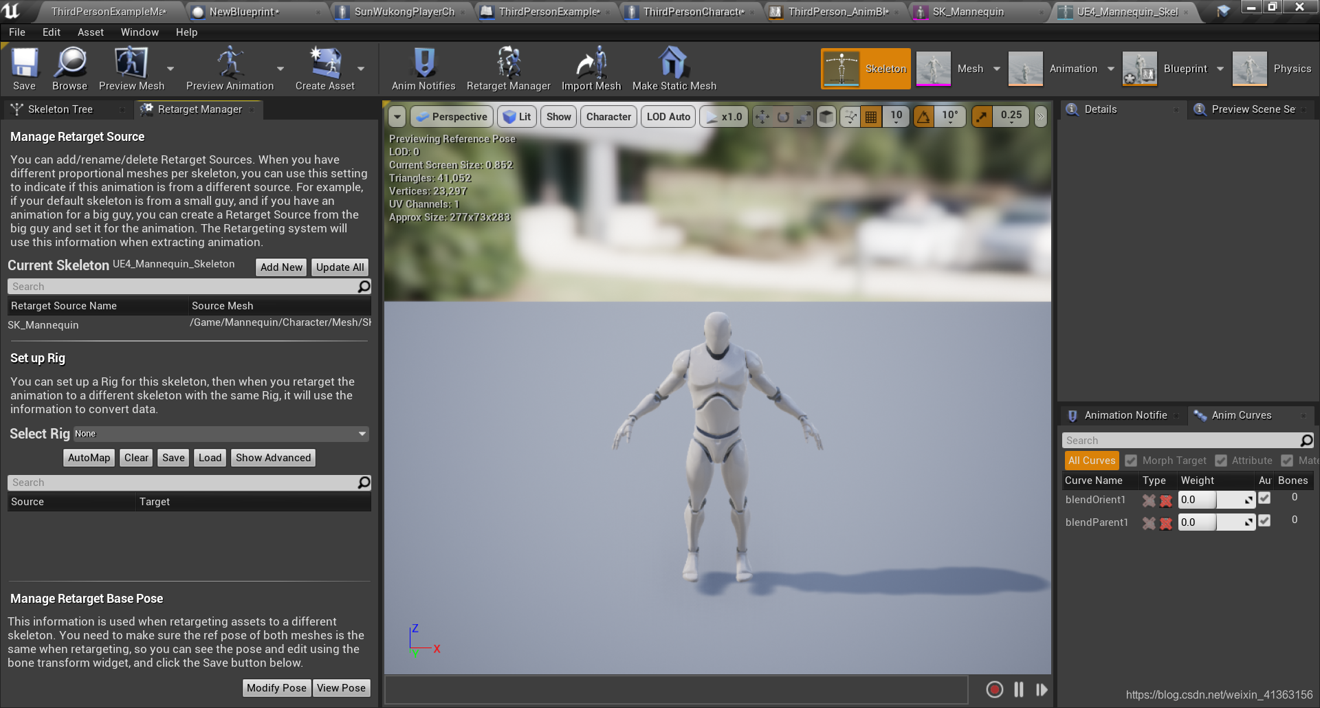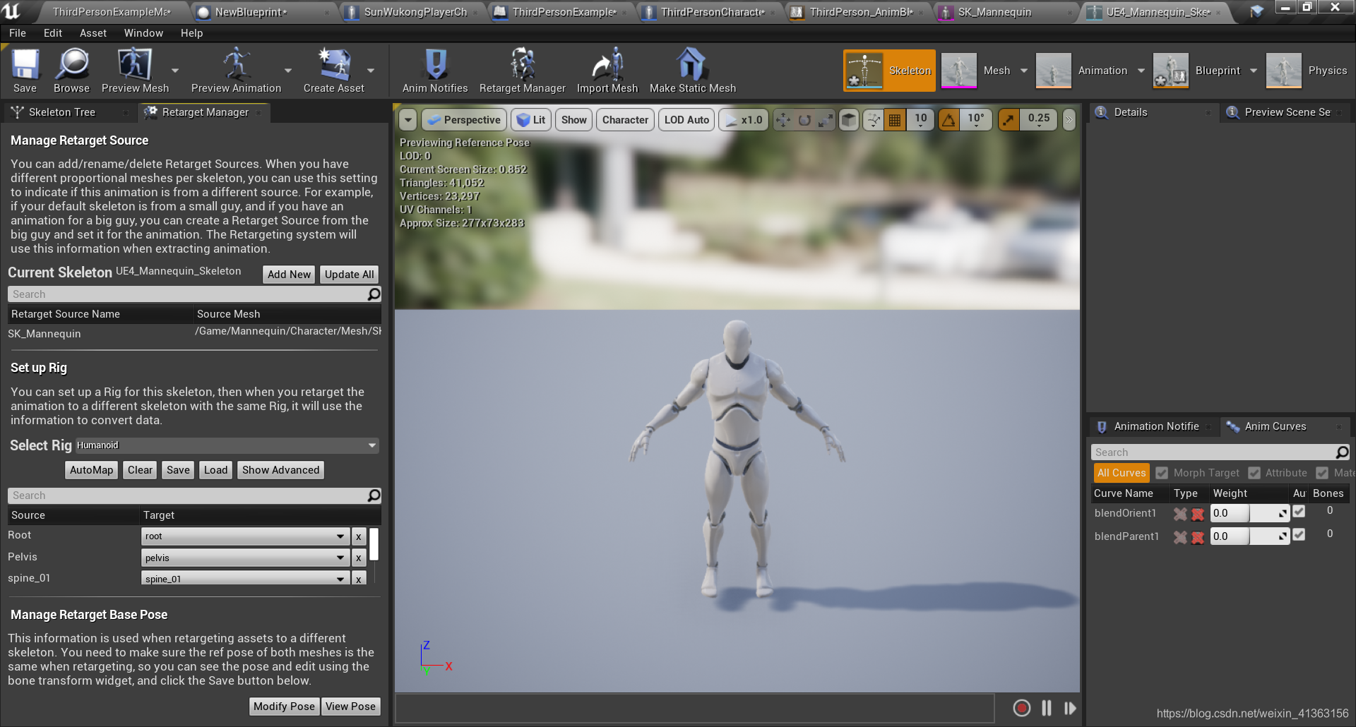 替换完Mesh和动画蓝图的第三人称模板,可以看到有的骨骼运动的位置是有问题的这个时候我们需要检查一下retarget中对应的骨骼是否存在问题,如果有问题修正过来就可以了。