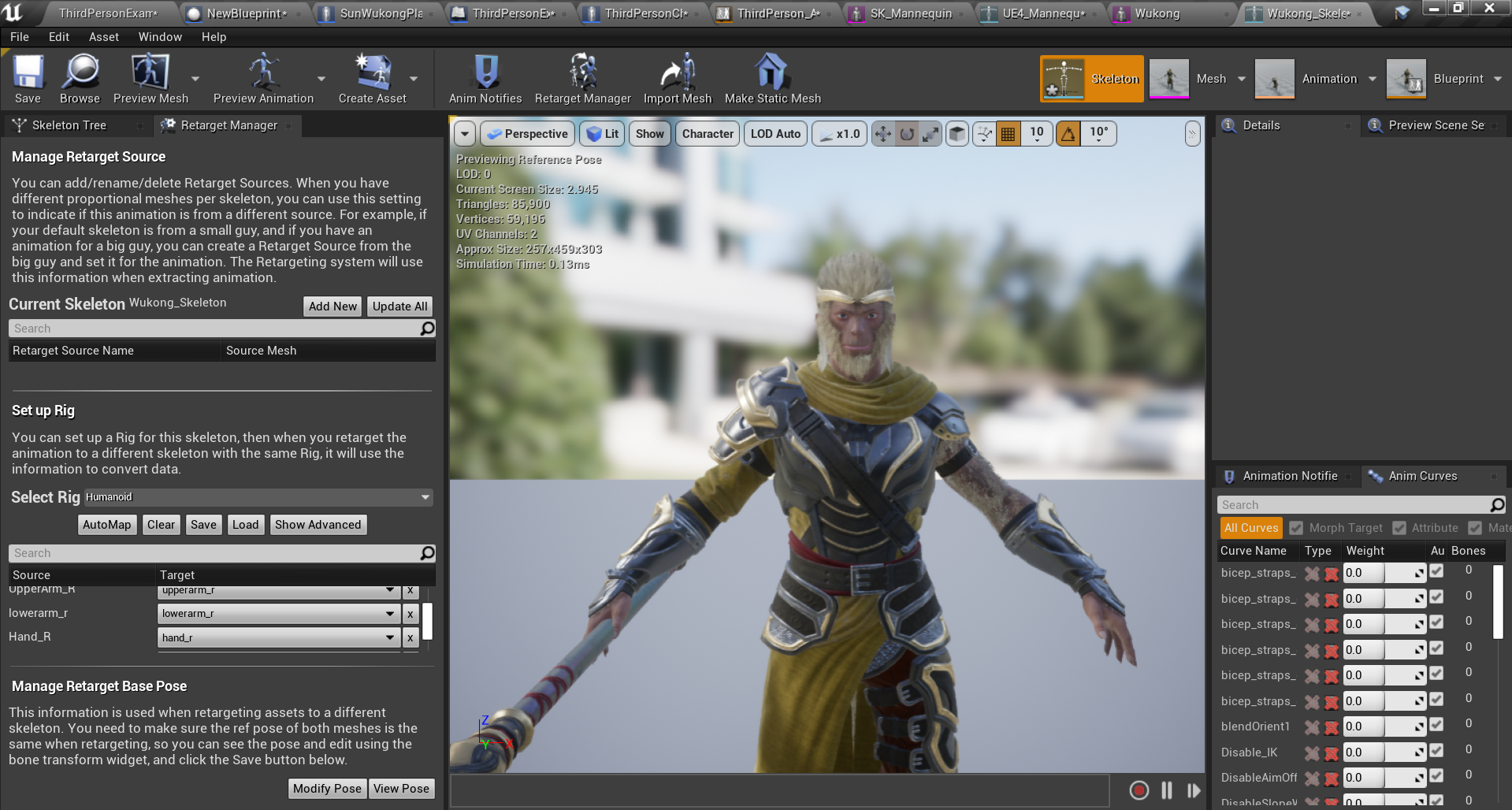 上面我们将机器人和悟空的骨骼分别对照虚幻的统一骨骼进行了一一对应,就等于悟空的骨骼和机器人的骨骼进行了关联。
