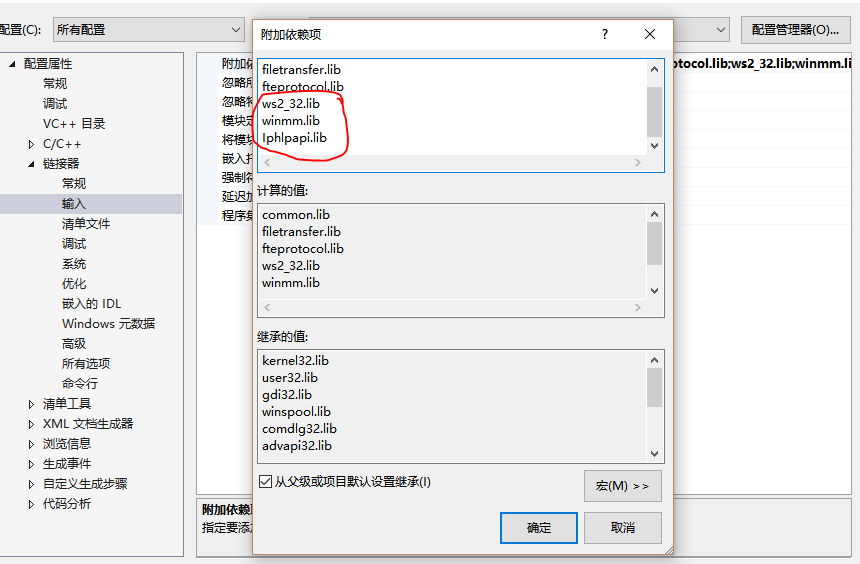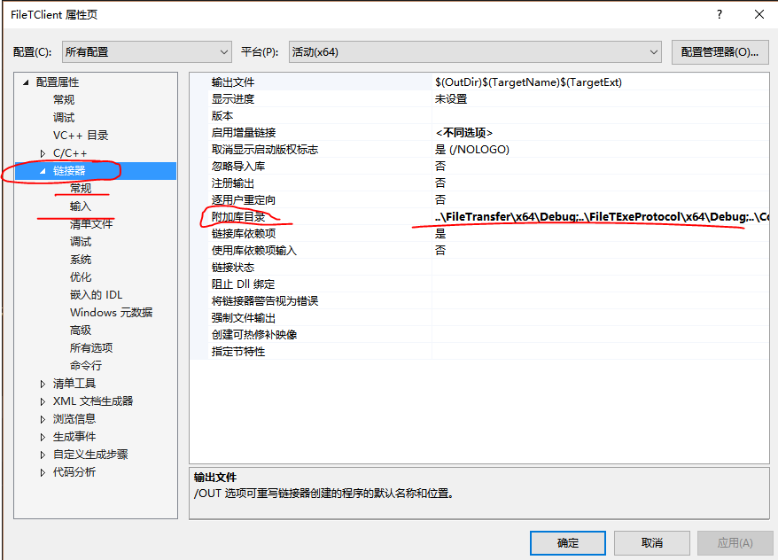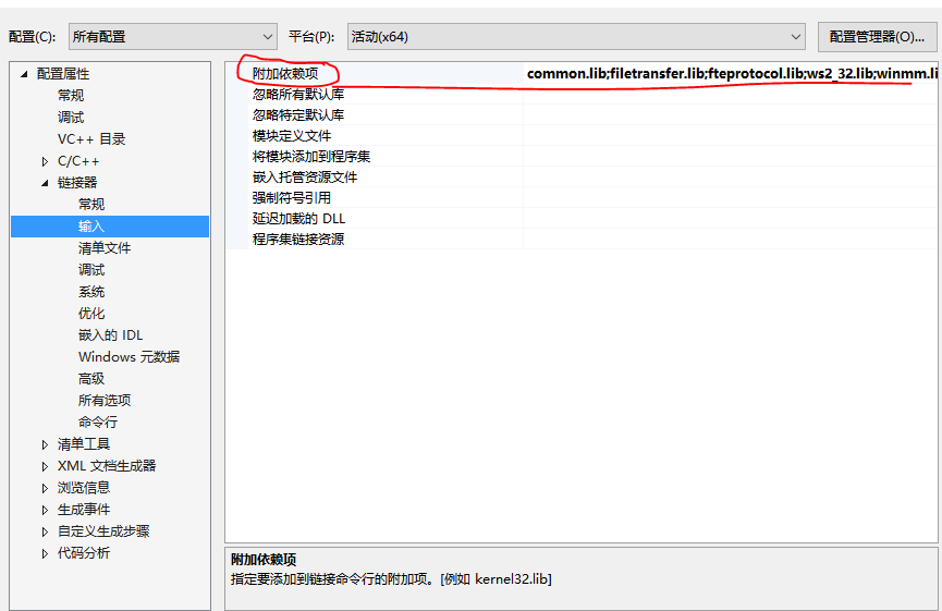 3、配置链接器。附加库目录为所依赖其他库文件位置,附加依赖项为所依赖其他库的文件名。如果依赖了动态库,此处填写其对应的so.lib,如果是静态库直接写其名a.lib。标红的三个windows下的库文件为常用库文件。
