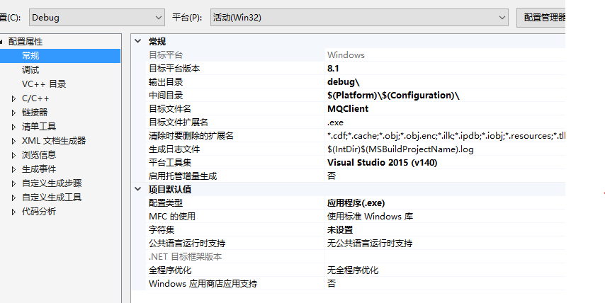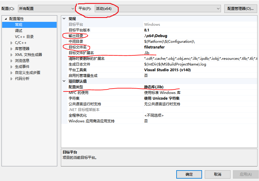 1、确定好最上端的配置和平台。当要进行发布时配置应选择Release,平台可选择x64和x86,配置库文件名和输出目录。
