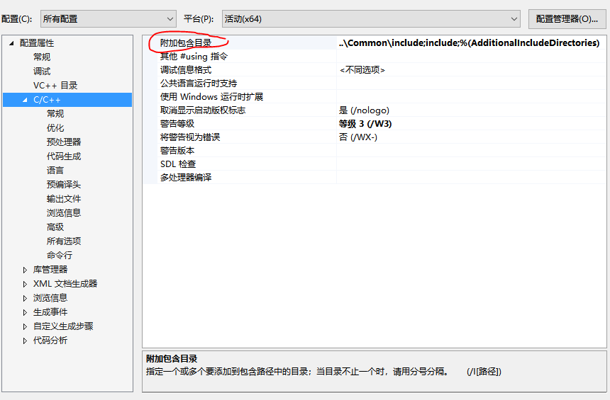 2、配置依赖头文件, 即附加包含目录,为工程依赖的头文件路径。