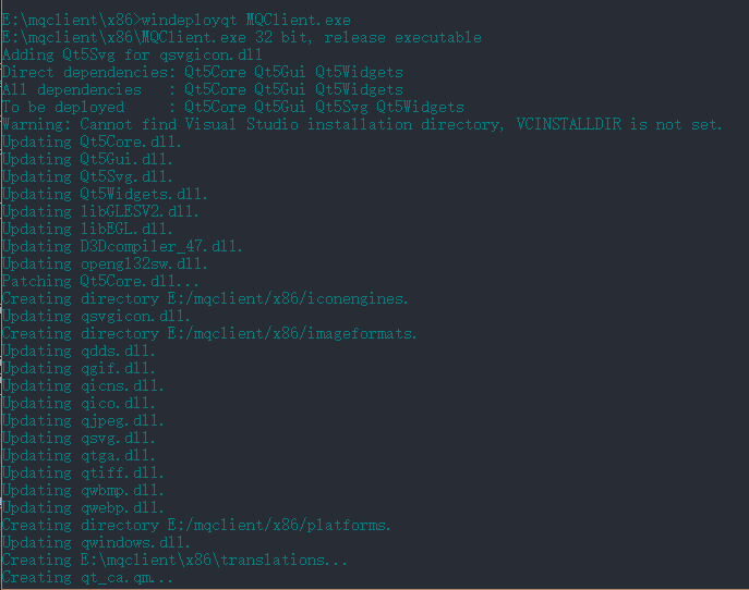 2、运行该程序后,进入你新建的文件夹,输入windeployqt xxxx.exe,则在新建的文件夹下会出现所依赖的文件。