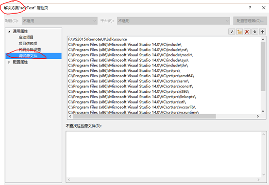 1、选择解决方案而非工程的属性,将所需的源码添加到调试源文件中。