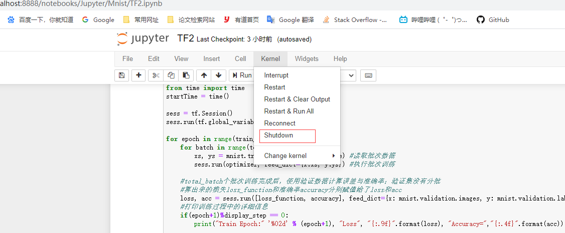 在jupyter中运行程序后,点击kernel中的shutdown。如下图所示