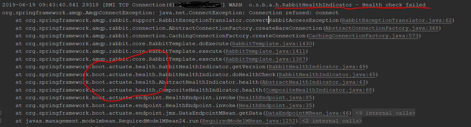 如上图异常可知,spring boot启动之后,spring boot Actuator会对其进行健康检查,对rabbit检查并没有通过,所以出现上述异常!