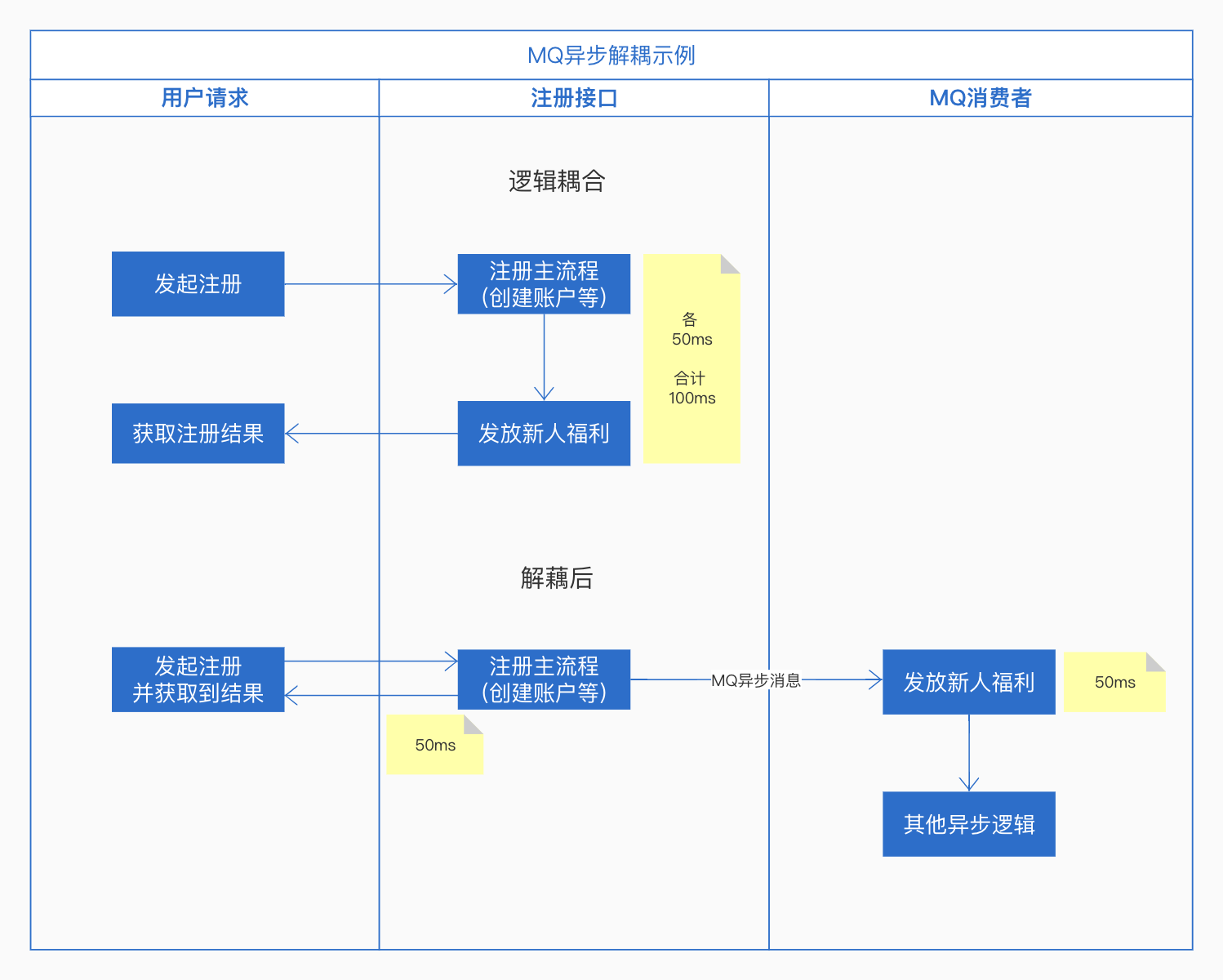 对于一个用户注册接口,假设有2个业务点,分别是注册、发放新人福利,各需要50ms去处理逻辑。如果我们将这两个业务流程耦合在一个接口,那么总计需要100ms处理完成。但是该流程中,用户注册时候,可以不用关心自己的福利是否立即发放,只要尽快注册成功返回数据即可,后续新人福利这一部分业务可以在主流程之外处理。我们如果将其剥离出来,接口主流程中只处理登陆逻辑,并通过MQ推送一条消息,通过异步方式处理后续的发放新人福利逻辑,这样即可保证注册接口50ms左右即能获取结果。而发放新人福利的业务,则通过异步任务慢慢处理。 通过拆分业务点,我们已经做到解耦,注册的附属业务中增加或减少功能点都不会影响主流程。另外如果一个业务主流程在某个点请求并发比较高,正好通过异步方式,可以将压力分散到更长的时间段中去,达到减轻固定时间段处理压力的目的,这就是流量削峰。